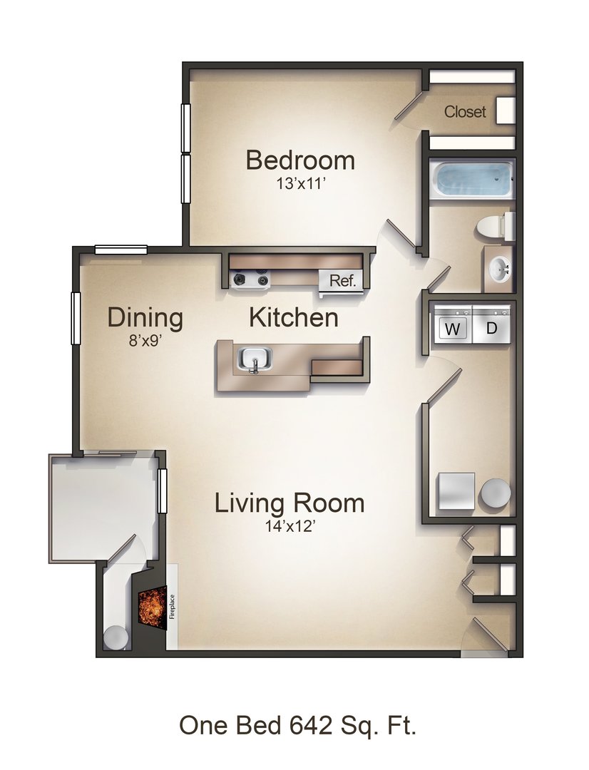 Our 1BD/1BA home has 642 square feet of heated space. The kitchen cabinetry provides amply storage of all your needs. The kitchen/dining room combination comes furnished with a range, frost-free refrigerator, garbage disposal and stainless steel sink. The master bedroom has a large walk-in closet with storage shelves. The living room and bedroom have large, light-filled windows. The walls are painted off white for easy matching. The floors consist of inlaid linoleum, and wall-to-wall carpeting.
